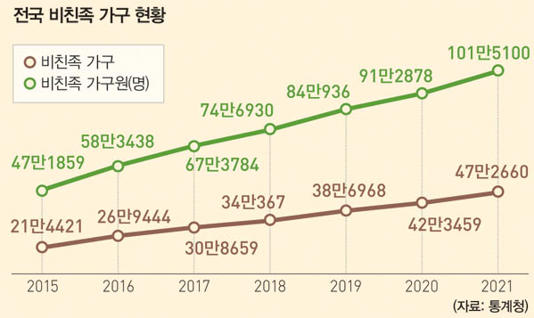 비친족 가구도 확연한 증가세를 보인다. 통계청 국가통계포털을 통해 확인한 2021년 비친족 가구는 47만2660가구다. 관련 통계를 작성한 이래 가장 많은 수치다. 이 가운데 2인 가구가 42만738가구로 압도적으로 많았다. 3인 가구는 3만7935가구, 4인은 1만116가구, 5인은 3871가구 등으로 조사됐다. 2015년 20만 가구대에서 지속적으로 증가해 2020년에 40만 가구를 넘어섰다. 가구원 수도 2021년 101만5100명을 기록했다. 2015년은 47만1859명으로 6년 동안 2배 이상 뛴 것이다.