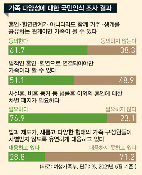 여성가족부가 2021년 6월 발간한 ‘가족 다양성에 대한 국민인식 조사’를 봐도 변화의 양상은 뚜렷했다. ‘혼인·혈연 관계가 아니어도 생계·주거 공유 관계이면 가족이 될 수 있다’에 61.7%가 동의했다. ‘거주·생계를 공유하지 않아도 정서적 유대를 가진 친밀한 관계이면 가족이 될 수 있다’는 의견에 45.3%가 긍정했다. 동의 비율은 2019년 38.2%에서 계속 증가했다.
