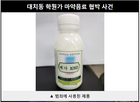한편, 지난 3일 오후 대치동 학원가에서 “기억력과 집중력 강화에 좋은 음료수가 개발됐다”며 무료 시음 행사를 진행하고 마약 성분이 든 음료수를 고등학생들에게 나눠준 사건이 발생했다.