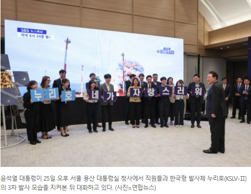 한편 윤 대통령은 이날 3차 발사 성공 직후 용산 대통령실에서 고흥 나로우주센터를 화상으로 연결해 이종호 과학기술정보통신부 장관으로부터 결과 보고를 받고 “한국항공우주연구원(항우연), 한화 에어로스페이스, 한국항공우주산업(KAI), 연구진과 기술자 여러분의 노고를 국민과 함께 치하하고 축하드린다”고 격려했다.