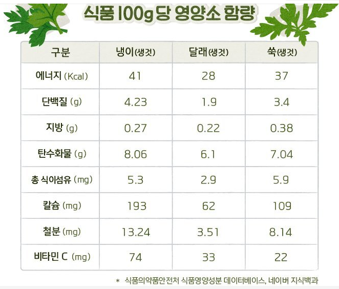 또한, 콜린 성분이 신경 안정 작용과 간 보호에도 도움을 줄 수 있습니다. 냉이는 잎의 색이 연하면서 뿌리가 가는 것이 좋습니다.