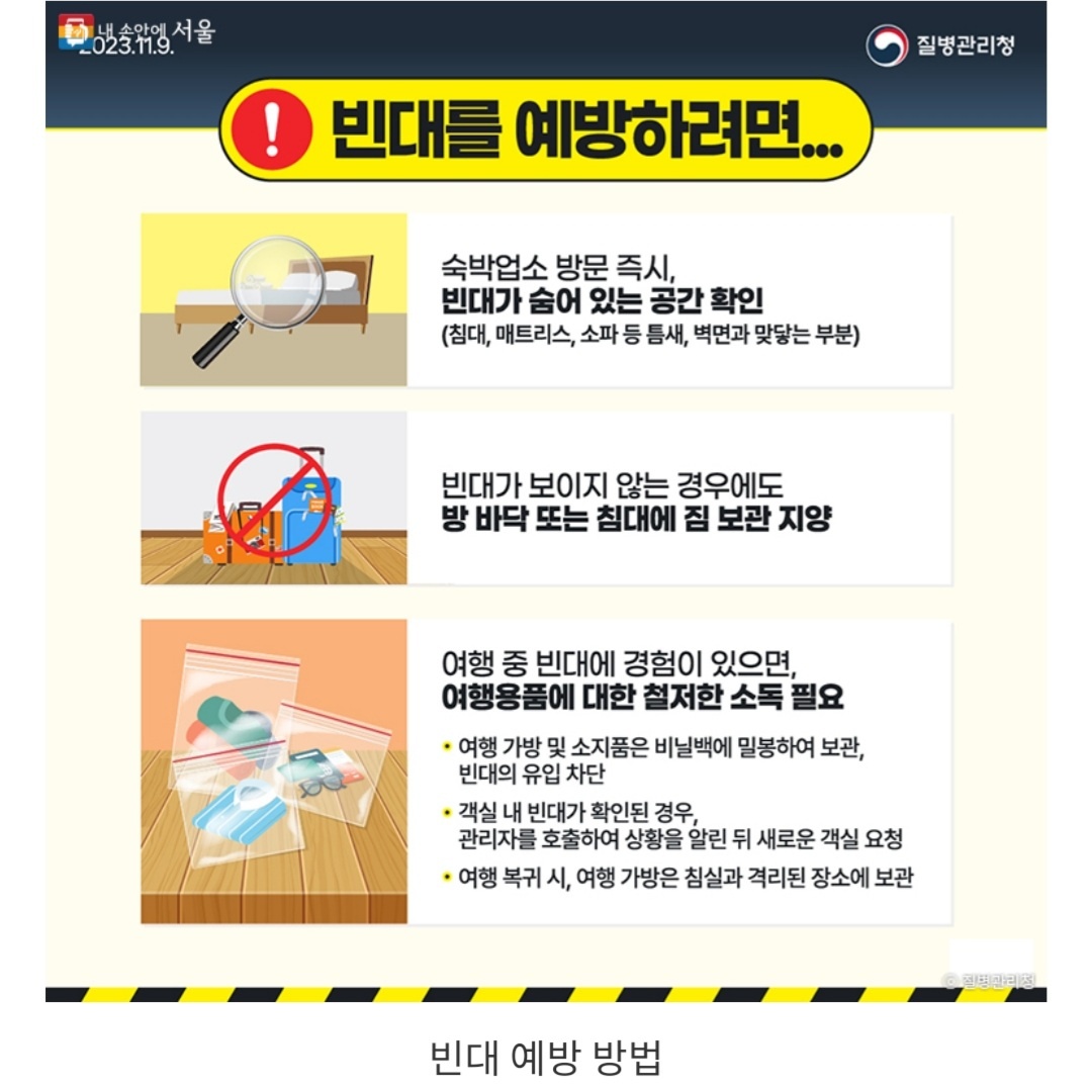 - 여행 중 빈대에 경험이 있으면, 여행용품에 대한 철저한 소독이 필요