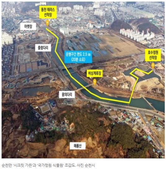 정원 드림호-정원박람회의 진화를 확인할 수 있는 또 하나의 콘텐트가 뱃길입니다. 순천시내를 가로지르는 동천을 따라 박람회장 상징인 순천만 호수정원으로 입장하는 항로입니다. KTX 순천역에서 도보로 5분거리인동천테라스에서 배를 타면 번거롭지 않게 박람회장에 도착할 수 있습니다.