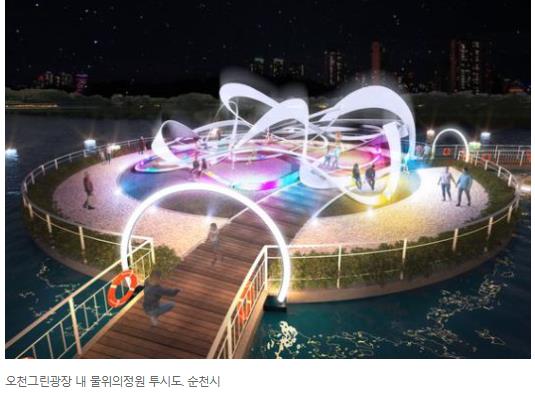 물 위의 정원-올해 순천만정원박람회는 ‘정원에 삽니다’라는 주제를 가장 잘 표현하기 위해 개막식을 도심정원에서 개최합니다. 도심 속 박람회장인 ‘오천 그린광장’에 개막식 주무대인 ‘물 위의 정원’을 띄운 컨셉입니다. 순천시내를 가로지르는 동천(東川)에 조성한 수상정원은 도시경관·야간경관과 어우러진 볼거리로 채워집니다.