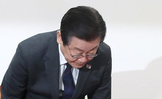 이재명 더불어민주당 대표가 17일 오전 서울 여의도 국회에서 열린 최고위원회의에서 고개 숙여 사과하고 있다.