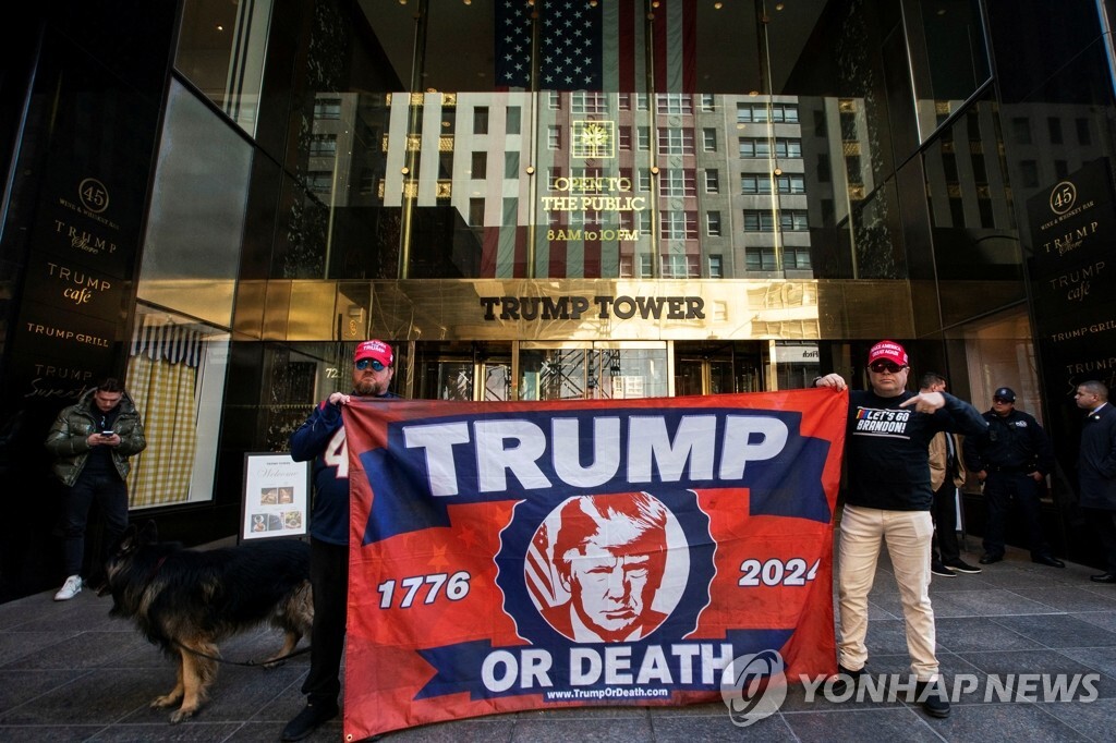 성추행 입막음 의혹으로 기소 위기에 처한 도널드 트럼프 전 미국 대통령의 지지자들이 지난 26일(현지시간) 뉴욕 트럼프 타워 앞에서 트럼프 전 대통령의 얼굴이 그려진 펼침막을 들고 서 있다. 트럼프 전 대통령은 2016년 대선 직전 과거에 자신과 성관계를 가졌다고 주장한 포르노 배우 출신 스테파니 클리포드에게 입막음을 조건으로 13만달러(약 1억7천만원)를 회삿돈으로 지급하고 장부를 조작했다는 의혹으로 검찰 수사를 받아왔다.