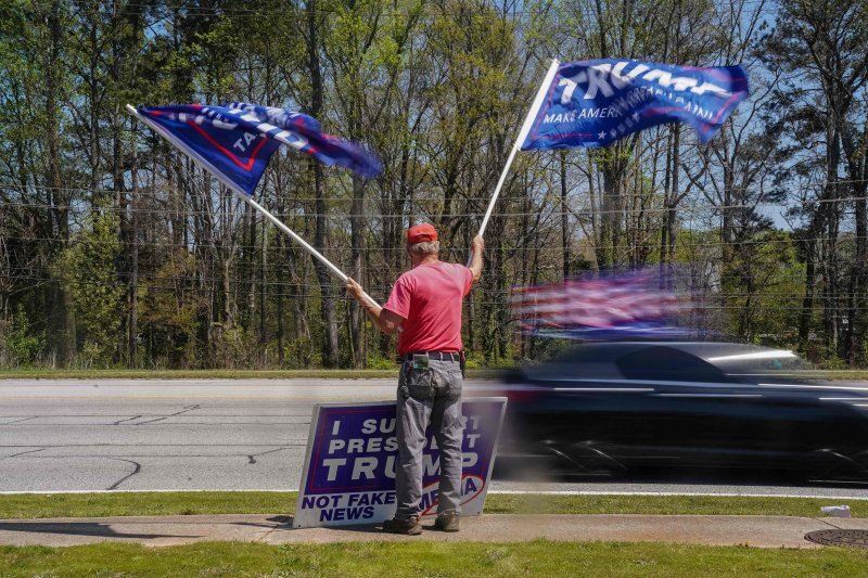 30일(현지시간) 미국 조지아주 스미르나에서 도널드 트럼프 전 대통령 지지 시민이 론 디샌티스 플로리다 주지사(공화)가 참석하는 행사장 밖에서 트럼프 지지 깃발과 피켓을 갖고 서있다.