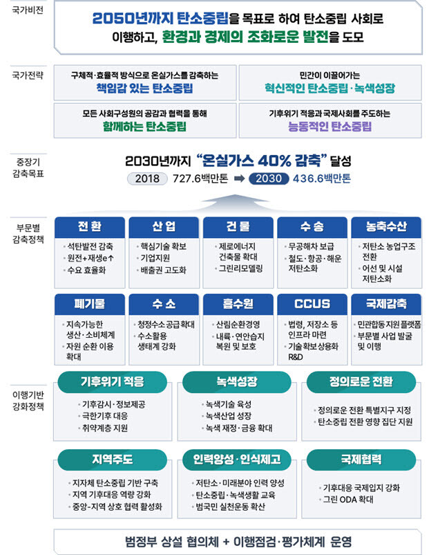2050 탄소중립녹색성장위원회는 21일 정부세종청사에서 '제1차 국가 탄소중립·녹색성장 기본계획(2023~2042년)'과 '2030년 국가 온실가스 감축목표(NDC) 달성을 위한 세부 이행방안'을 공개했다.