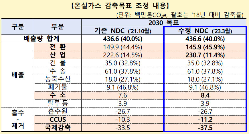 우선 산업 부문은 원료 수급과 기술 전망 등 현실적 여건을 고려해 탄소 감축 목표를 14.5%(2억2260만톤)에서 11.4%(2억3070만톤)로 3.1%포인트(P) 낮췄다. 이산화탄소 포집·저장·활용(CCUS) 부문은 국내 탄소저장소를 확대하고 온실가스 흡수량을 증가시킬 수 있는 점을 반영, 애초 1030만톤에서 1120만톤으로 감축 목표치를 상향했다.